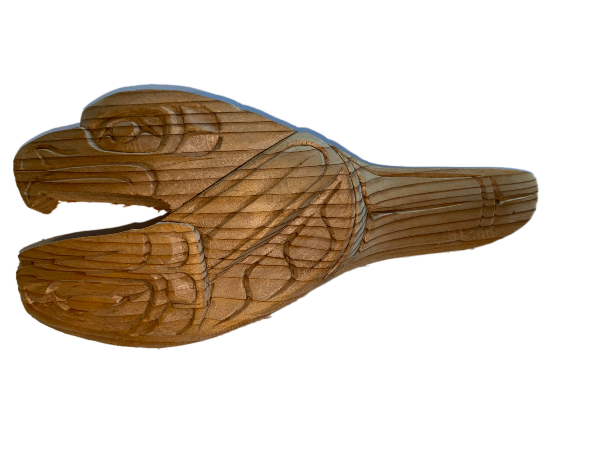 A Cedar carving using traditional West Coast Indigenous art in the shape of an eagle paired with an orca.