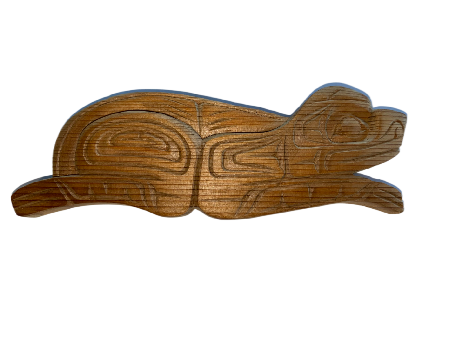 A Cedar carving using traditional West Coast Indigenous art in the shape of a frog.