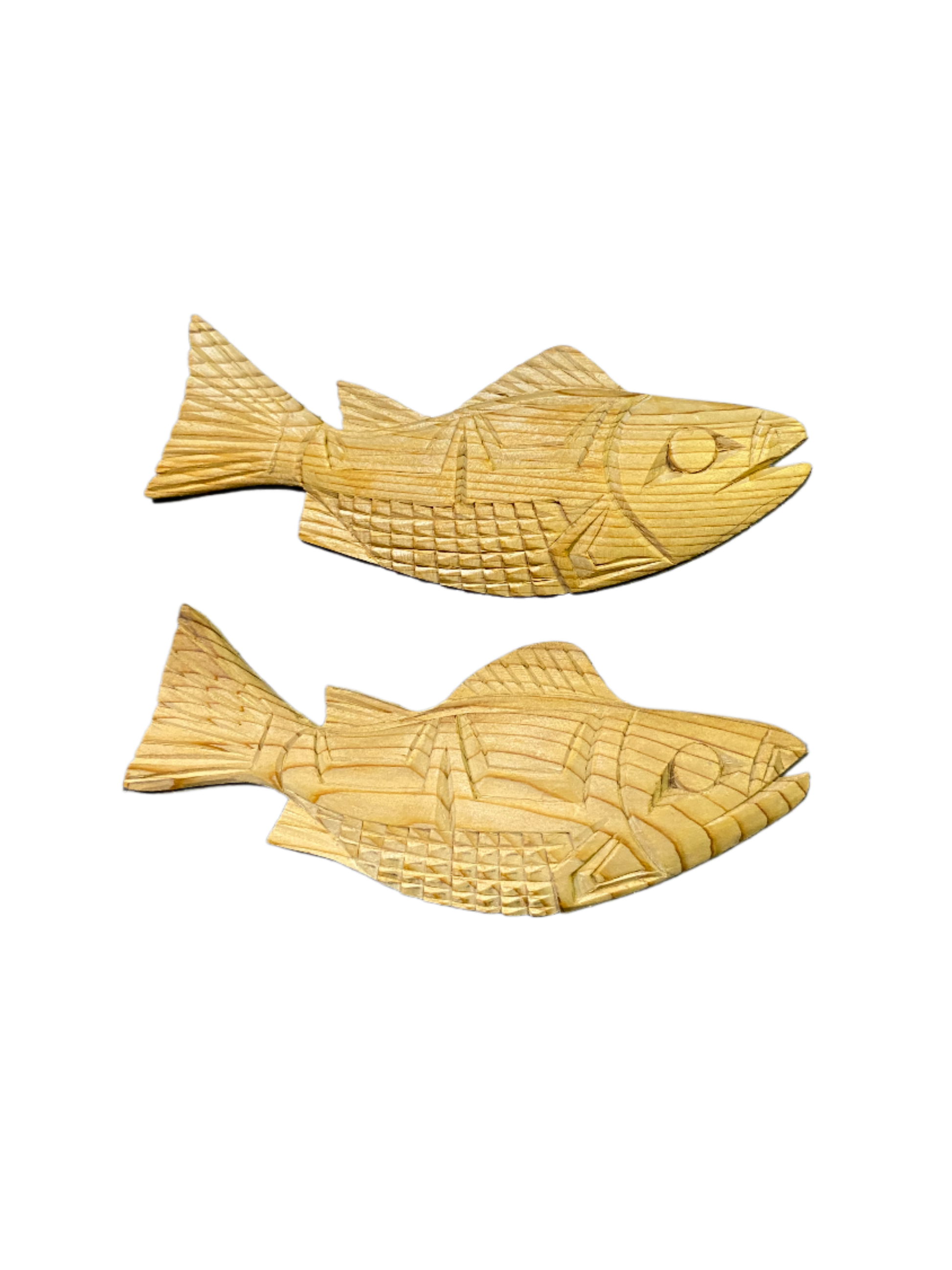 A small cedar carving using traditional West Coast Indigenous art in the shape salmon.