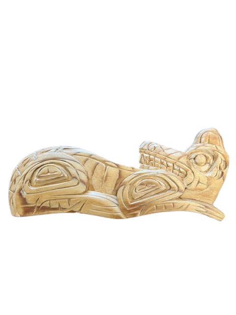 A Cedar carving using traditional West Coast Indigenous art in the shape of a wolf.